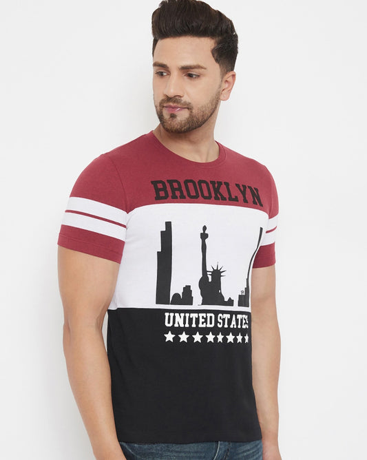 Maroon White Black Printed 3 Pannel F Sleeves T-Shirt Striped Men Round Neck White, Maroon, Black T-Shirt